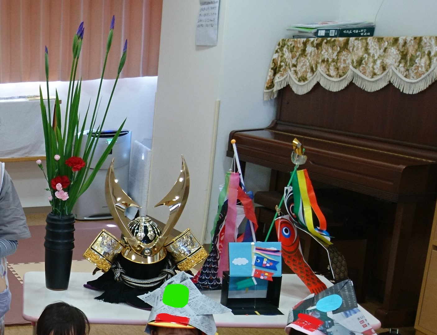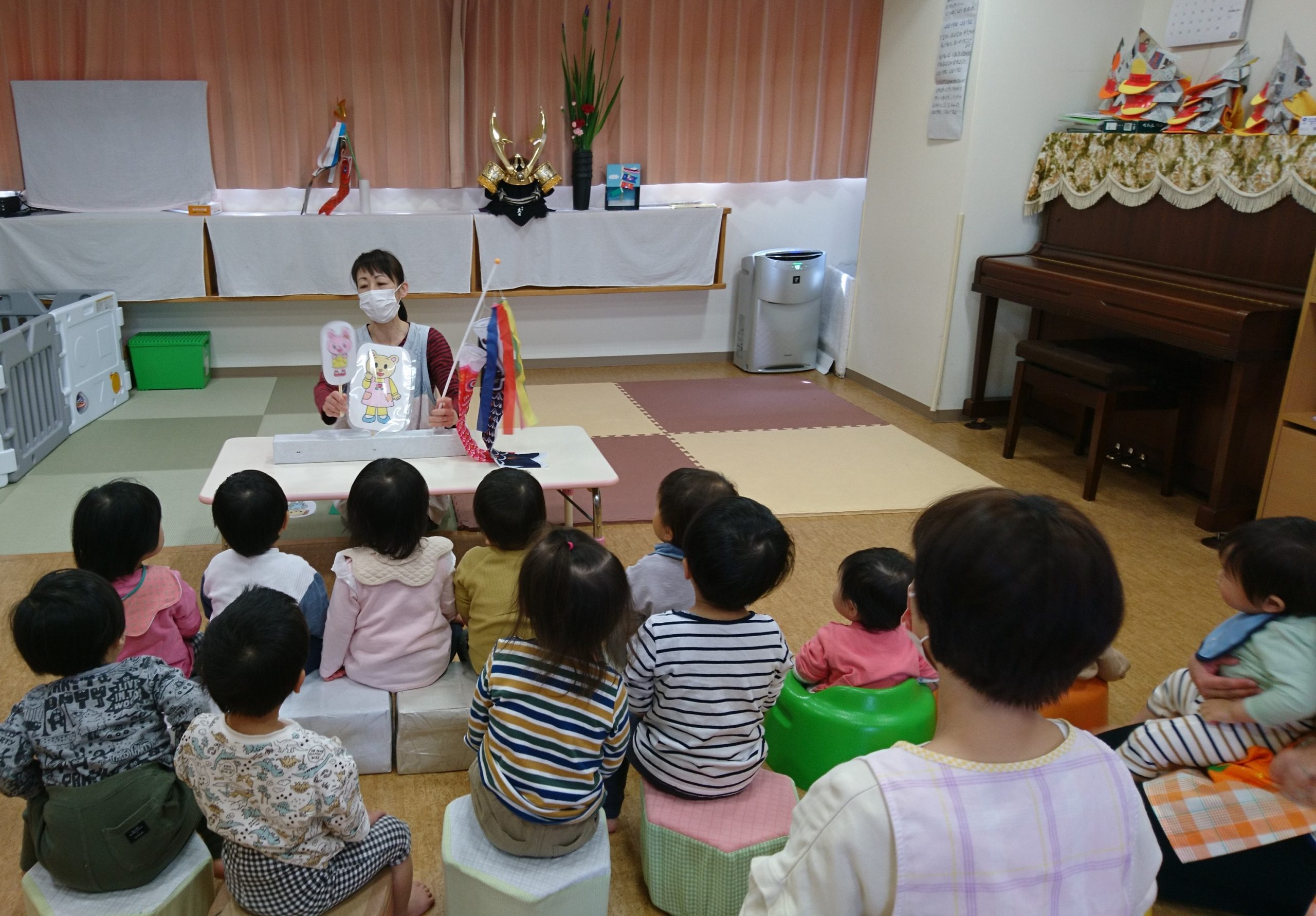 園の様子 こどもの日の集い 2021年4月27日 / 5月5日はこどもの日です。 今日は保育士がこいのぼりやかぶと、しょうぶの花を飾っていると 何が始まるんだろうとワクワクしていた子どもたち。 ペープサートで由来を観たり、 ”こいのぼり”の歌に合わせて踊ったりしました♪ 手づくりのかぶとを被り、作ったこいのぼりを持つと… みんなとっても強そうです!! こいのぼりのように、元気にたくましくおおきくなぁれ!!