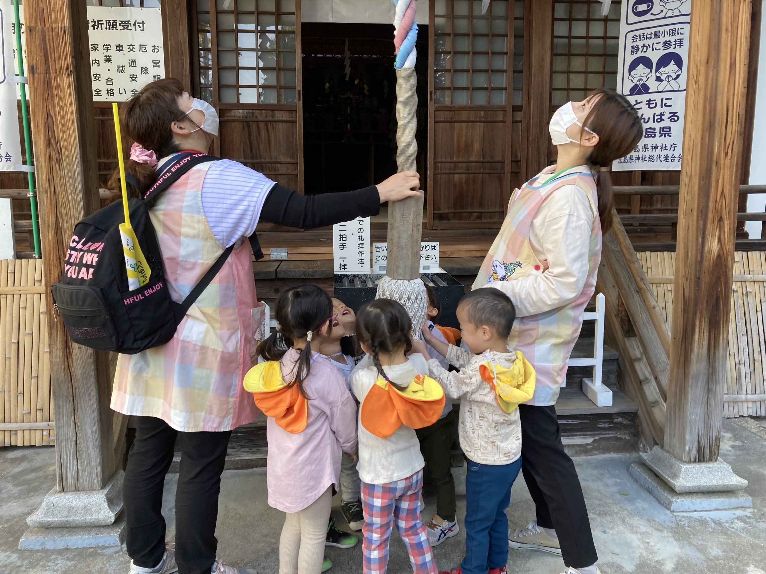園の様子 七五三のお参りに行ったよ 2022年11月15日 / 今日は、七五三の日ですね。 アーブルKIDS のゾウチームさんに3歳のお友だちがいるので、鹿籠神社へお参りに行きました。 ゾウチームさんは1人ずつお賽銭をもらって、お賽銭箱に入れました。 本坪鈴を鳴らして、「みんなが元気に大きくなりますように…。」とみんなでお参りしました。 お天気もよく、絶好の七五三日和でした!!